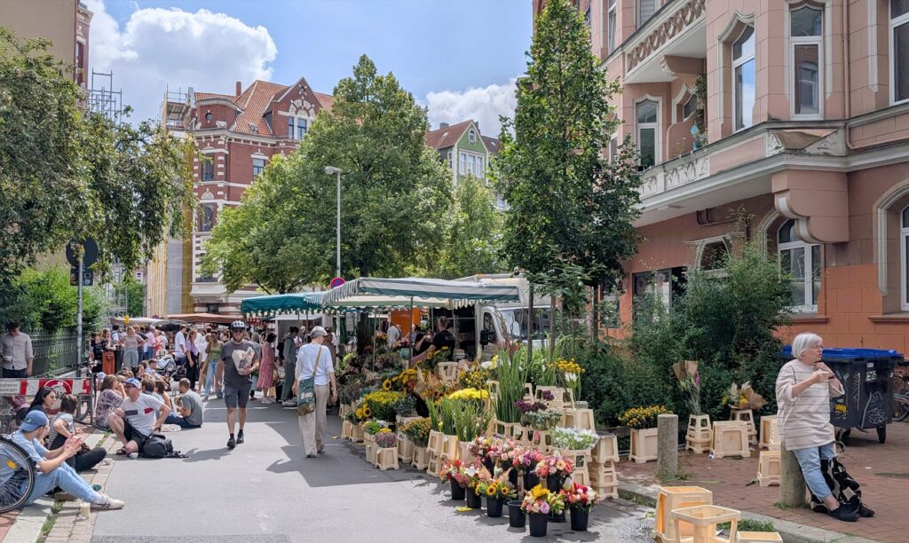 Was wir im Sommer 2025 an Samstagen in der Davenstedter Straße 5 vorfinden, ist im Grunde genommen die logische Erweiterung des Marktgeschehens am nordwestlichen Ende des Lindener Marktplatzes: Dort gibt es gleich mehrere Möglichkeiten, einen perfekten Cappuccino to Go von einem Barista gemacht zu bekommen und diesen noch vor Ort zu genießen – Entweder direkt am Straßenrand, der Verkehr ist zu Marktzeiten gesperrt, oder sitzend auf der halbhohen Mauer am Bauplatz des kommenden Hauses (Nr.) 5. Von Jung bis Alt finden sich hier Lindener aber auch Besucher aus ganz Hannover und der umliegenden Region zusammen, um nach dem Einkauf abzuschalten, sich auszutauschen und gegenseitig auf den neuesten Stand zu bringen. So könnte man zurecht von einer Art Lindener Forum auf der Davenstedter Straße Nr. 5 sprechen…