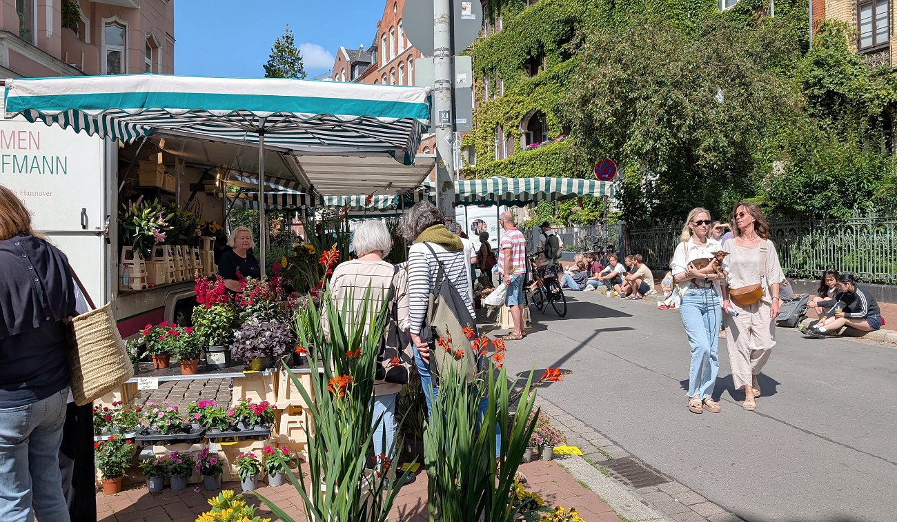 Was wir im Sommer 2025 an Samstagen in der Davenstedter Straße 5 vorfinden, ist im Grunde genommen die logische Erweiterung des Marktgeschehens am nordwestlichen Ende des Lindener Marktplatzes: Dort gibt es gleich mehrere Möglichkeiten, einen perfekten Cappuccino to Go von einem Barista gemacht zu bekommen und diesen noch vor Ort zu genießen – Entweder direkt am Straßenrand, der Verkehr ist zu Marktzeiten gesperrt, oder sitzend auf der halbhohen Mauer am Bauplatz des kommenden Hauses (Nr.) 5. Von Jung bis Alt finden sich hier Lindener aber auch Besucher aus ganz Hannover und der umliegenden Region zusammen, um nach dem Einkauf abzuschalten, sich auszutauschen und gegenseitig auf den neuesten Stand zu bringen. So könnte man zurecht von einer Art Lindener Forum auf der Davenstedter Straße Nr. 5 sprechen…